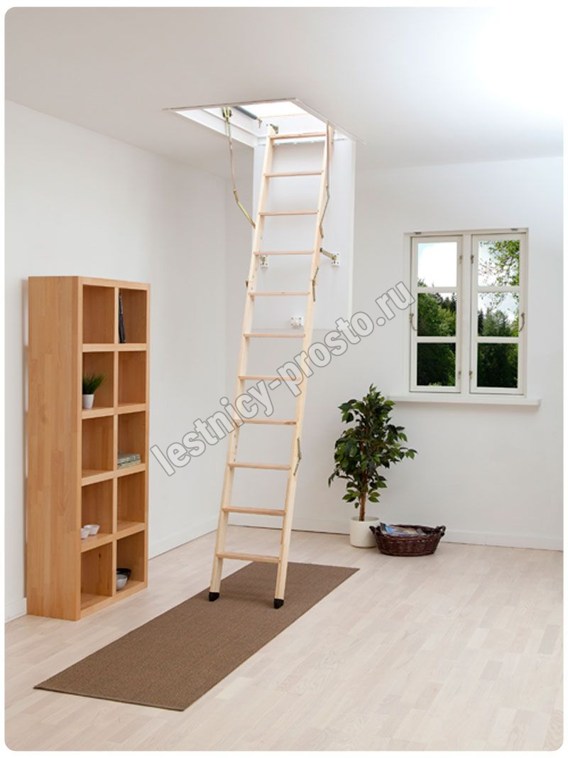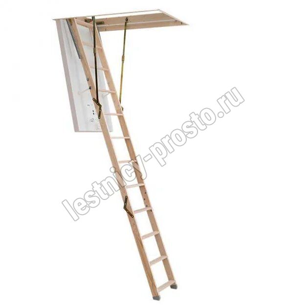 В комплекте: люк из сэндвич-панели, пружинный механизм "короб-рычаг", короб, трехсекционная лестница с буковыми ступенями, замок люка, штанга для раскладывания лестницы, пластиковые наконечники для ножек