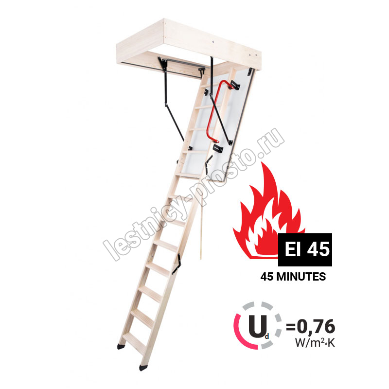 Модель лестницы MAXI EI45 идеально подходит для установки в помещениях подверженных возгоранию, её противопожарные свойства позволят эффективно изолировать помещение, в котором возник пожар, от чердака, тем самым предотвращая дальнейшее распространение огня. Лестница имеет в комплекте нескользящие насадки на ножки, которые идеально прилегают к полу, предотвращают появление царапин и придают лестнице эстетичный вид после ее резки (подгонки по высоте).