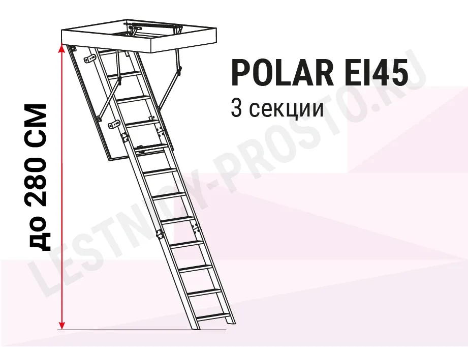 Лестница EI45 POLAR отличается тройным уплотнением, включая одинарное противопожарное уплотнение и люк толщиной 86 мм. Крышка люка утеплена пенопластом, облицована с двух сторон ДСП белого цвета.