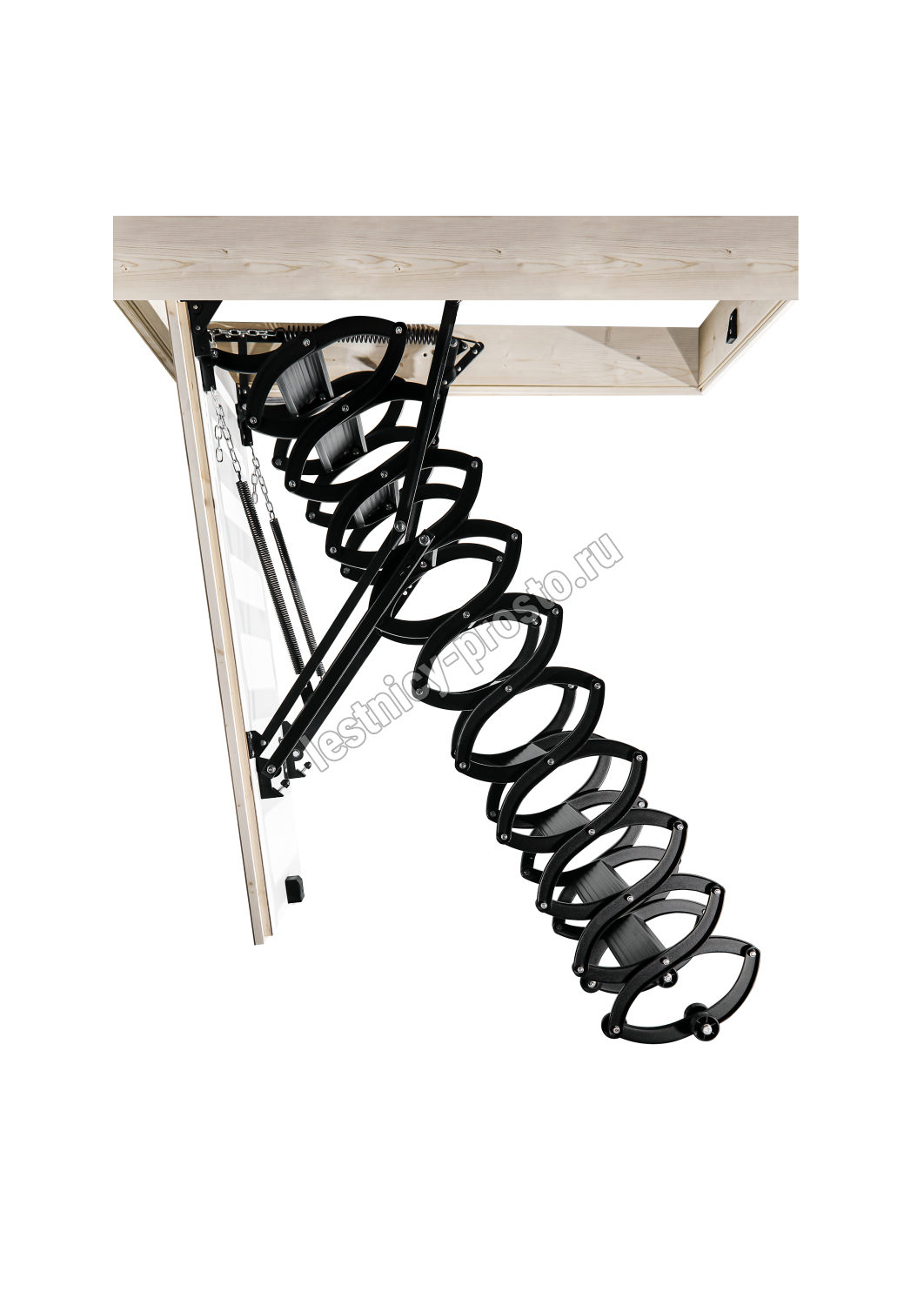 • Материалы: корпус и утепленный люк из древесины хвойных пород с теплоизоляцией из пенопласта; ступени и тетивы из металла для максимальной прочности.