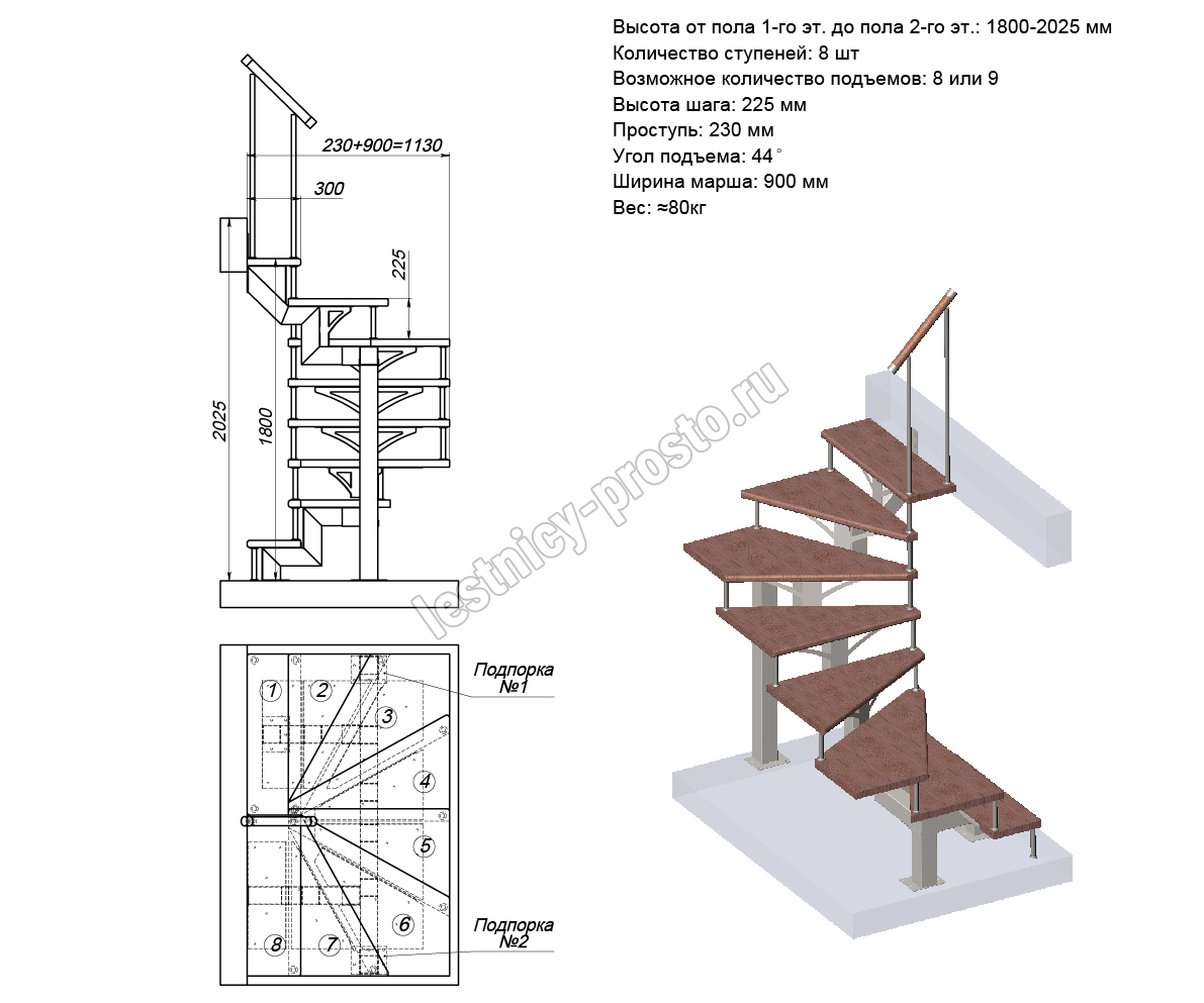 Высота лестницы 1800 - 2025 (8 ступеней) мм