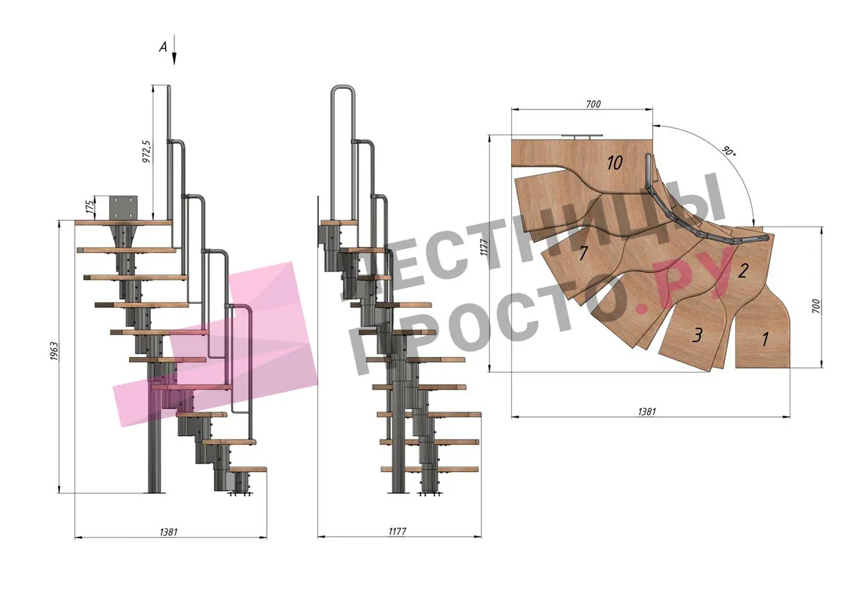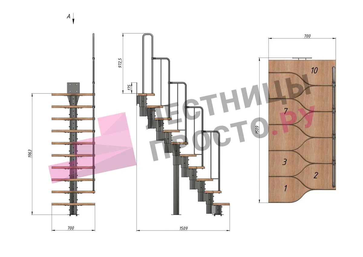 Лестница Prosto Urban Black гусиный шаг 700 мм, h180-264 см (10 ступеней), бук