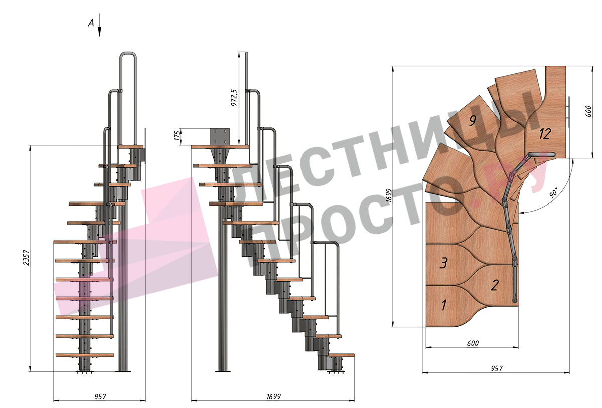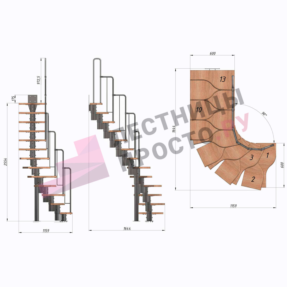 | Лестница Prosto Urban Grey г-образная гусиный шаг 600 мм, h216-312 см (12 ступеней) |