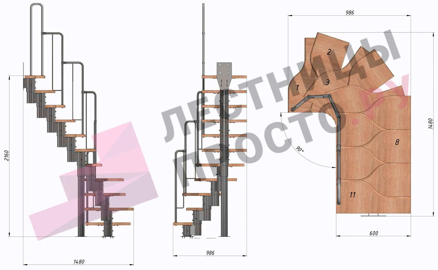 | Лестница Prosto Urban Grey г-образная гусиный шаг 600 мм, h198-288 см (11 ступеней) |