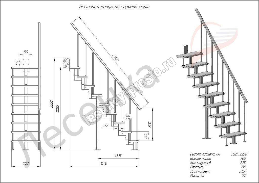 Модульная малогабаритная лестница Линия 2025-2250, Серый, Сосна, Крашеная, Без Ступений