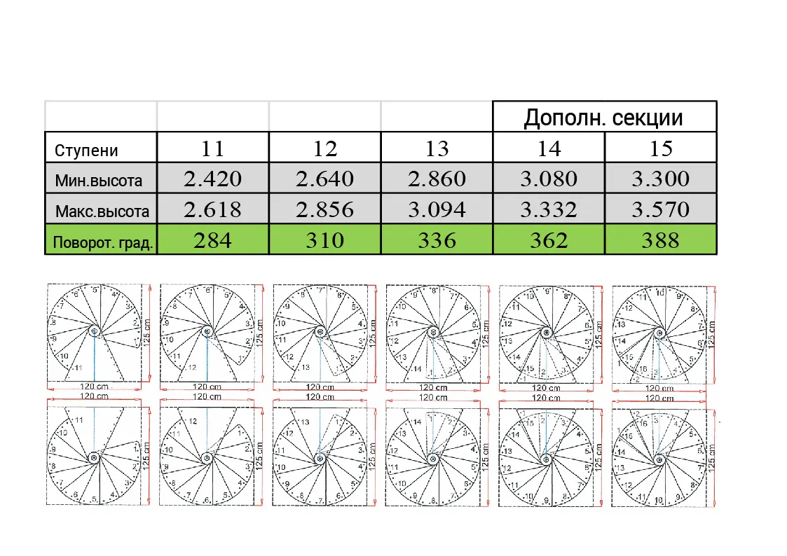 Благодаря возможности регулировать высоту шага с помощью пластиковых вставок (входят в базовый комплект), высоту лестницы можно варьировать в пределах от 2860 до 3090 мм. Кроме того, купив дополнительную секцию для этой лестницы, можно поднять высоту до 3320 мм.
