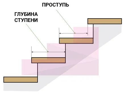 Глубина ступени горизонтальное расстояние от края ступени до подступенка (в случае его отсутствия — до другого края). Стандартная глубина ступени рассчитана на стопу взрослого человека среднего роста и составляет 25-30 см.